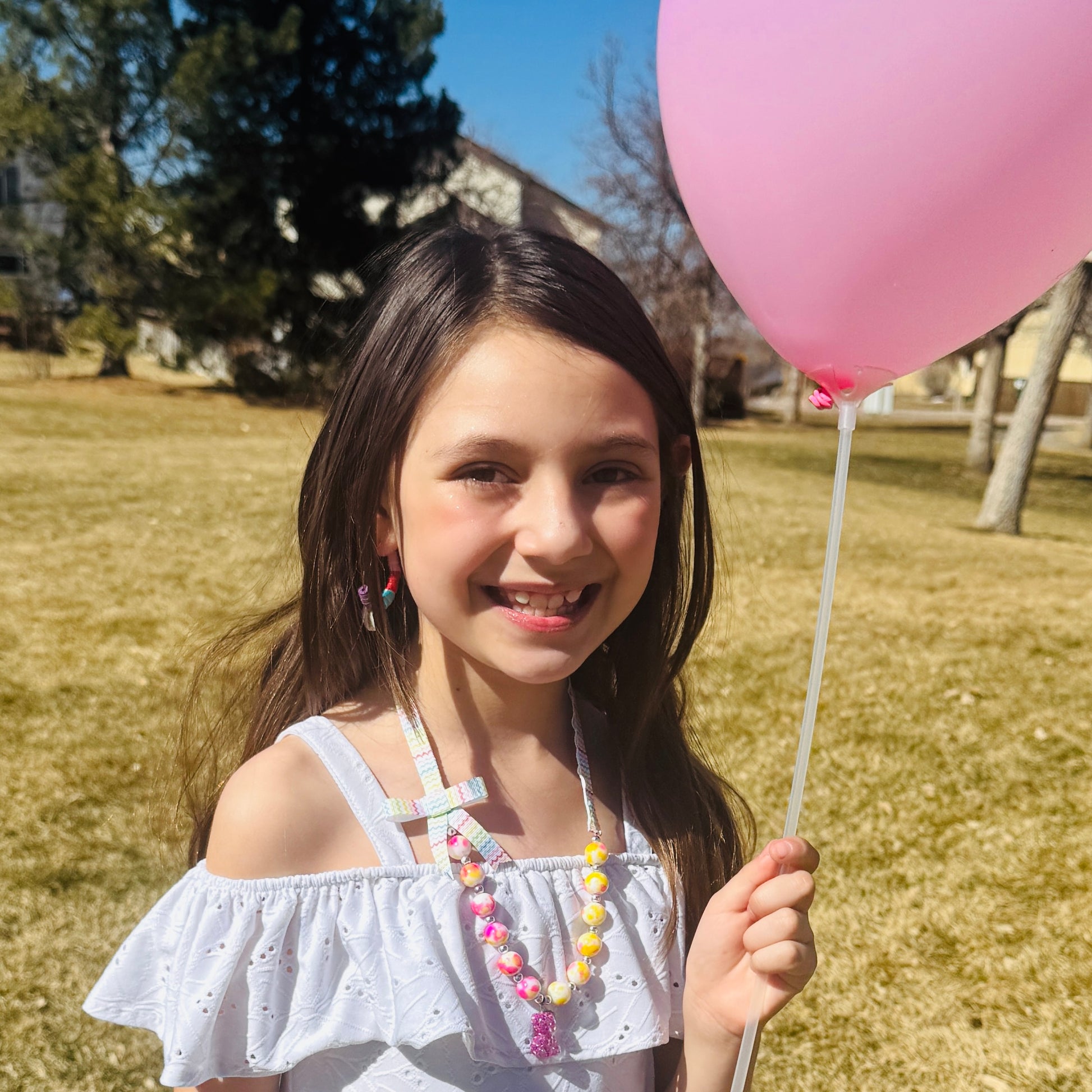 Kids handmade necklace made with tie dyed ceramic hot pink and yellow beads adorned with colorful ribbon chain and a spartly resign bear.