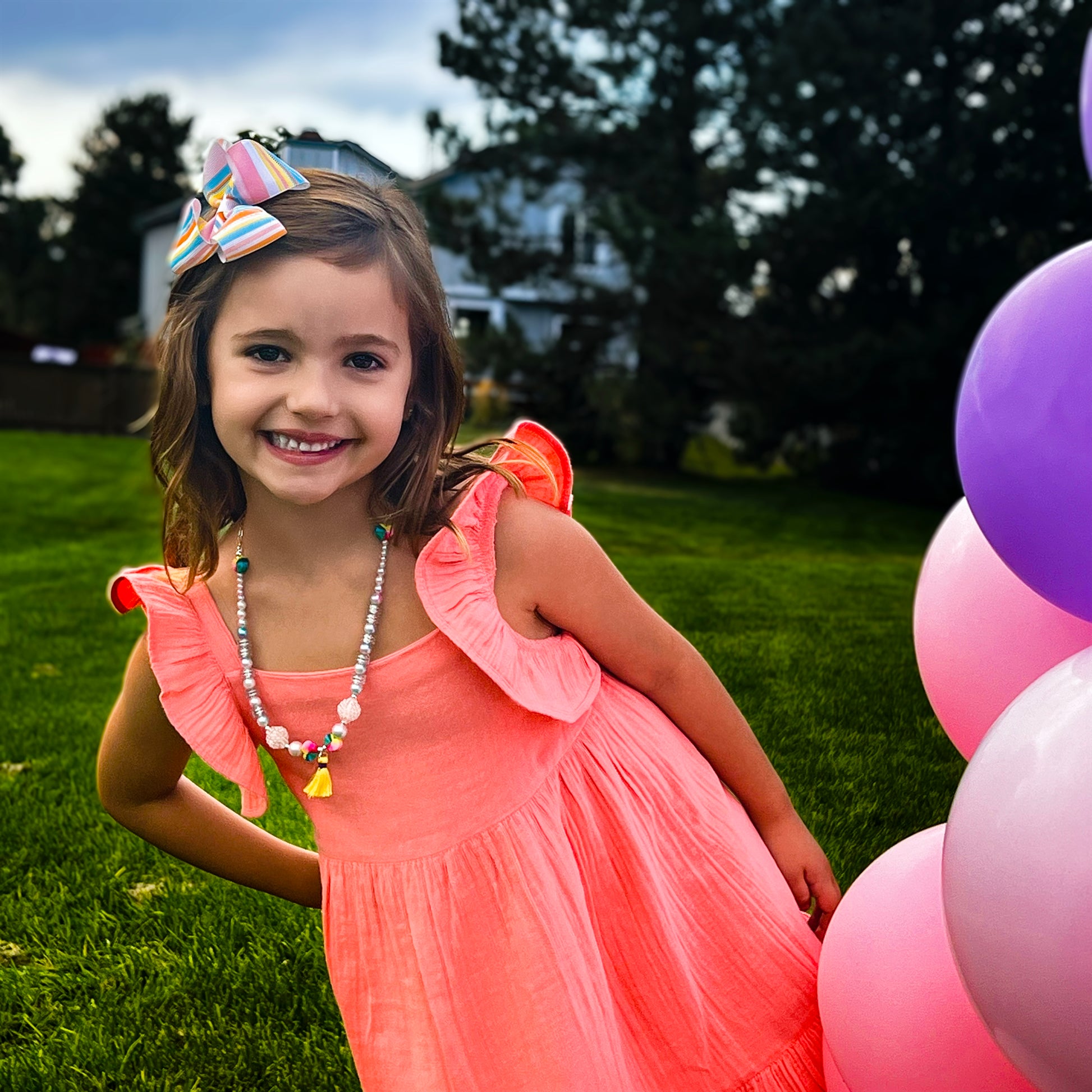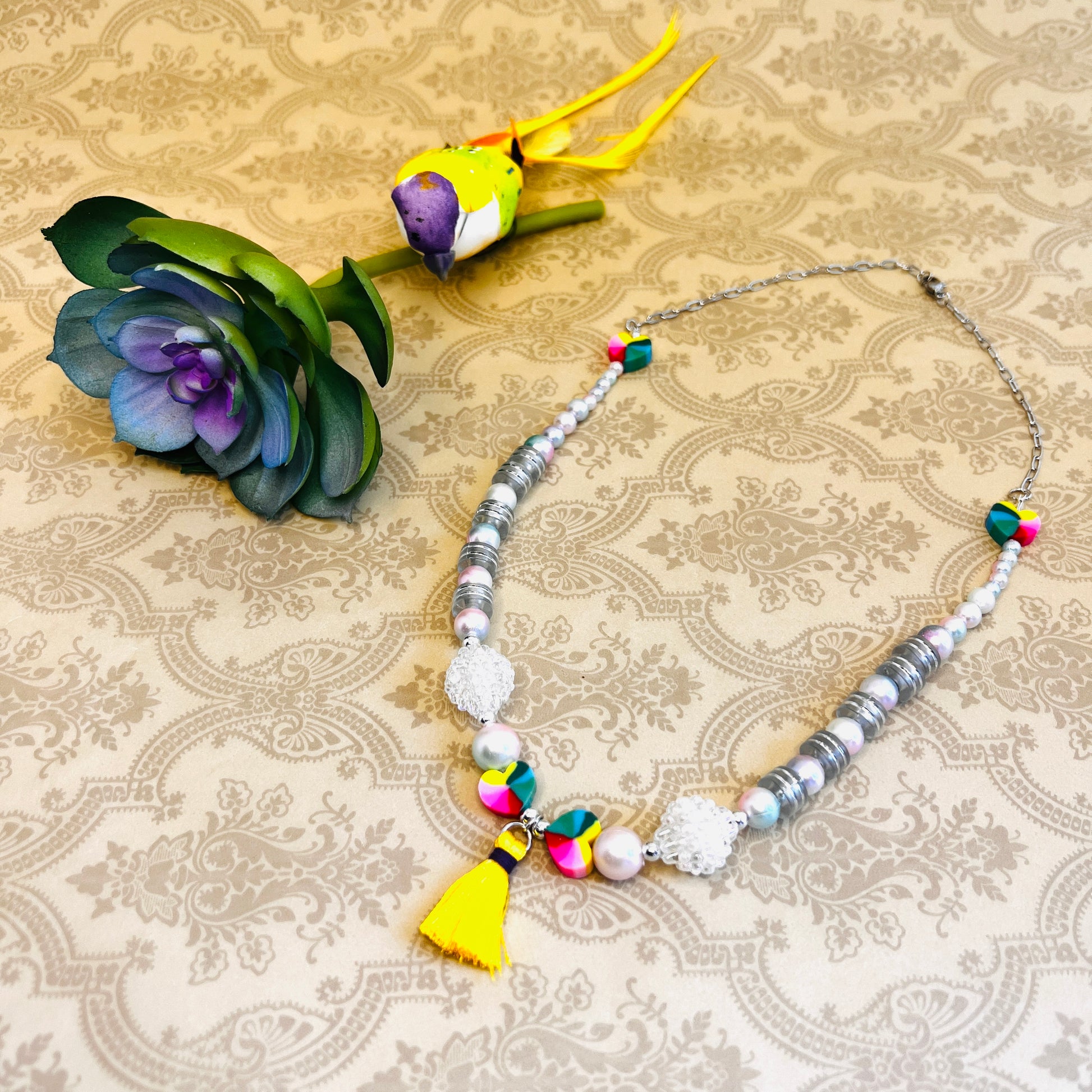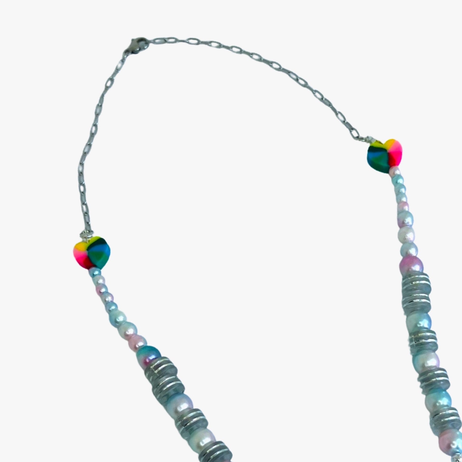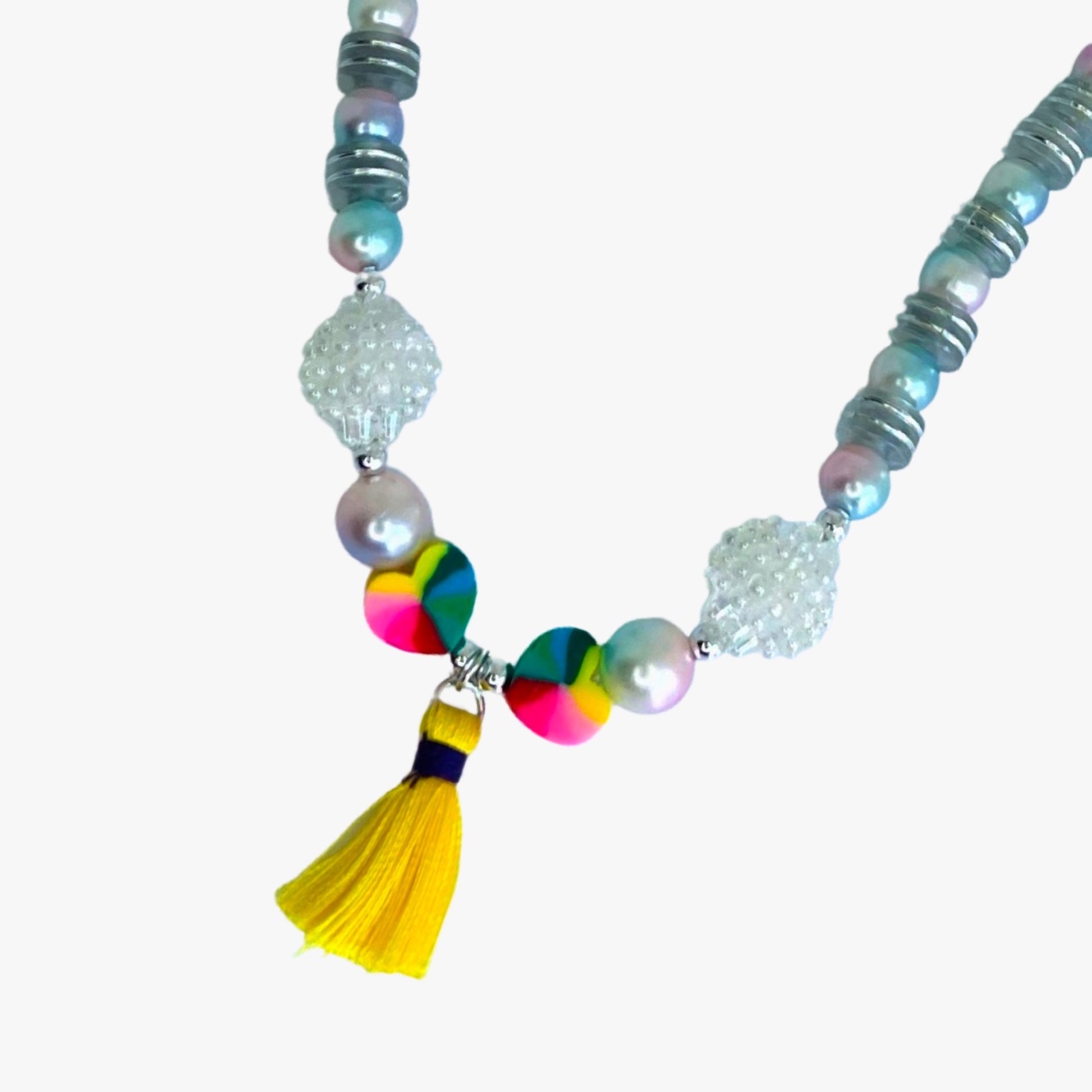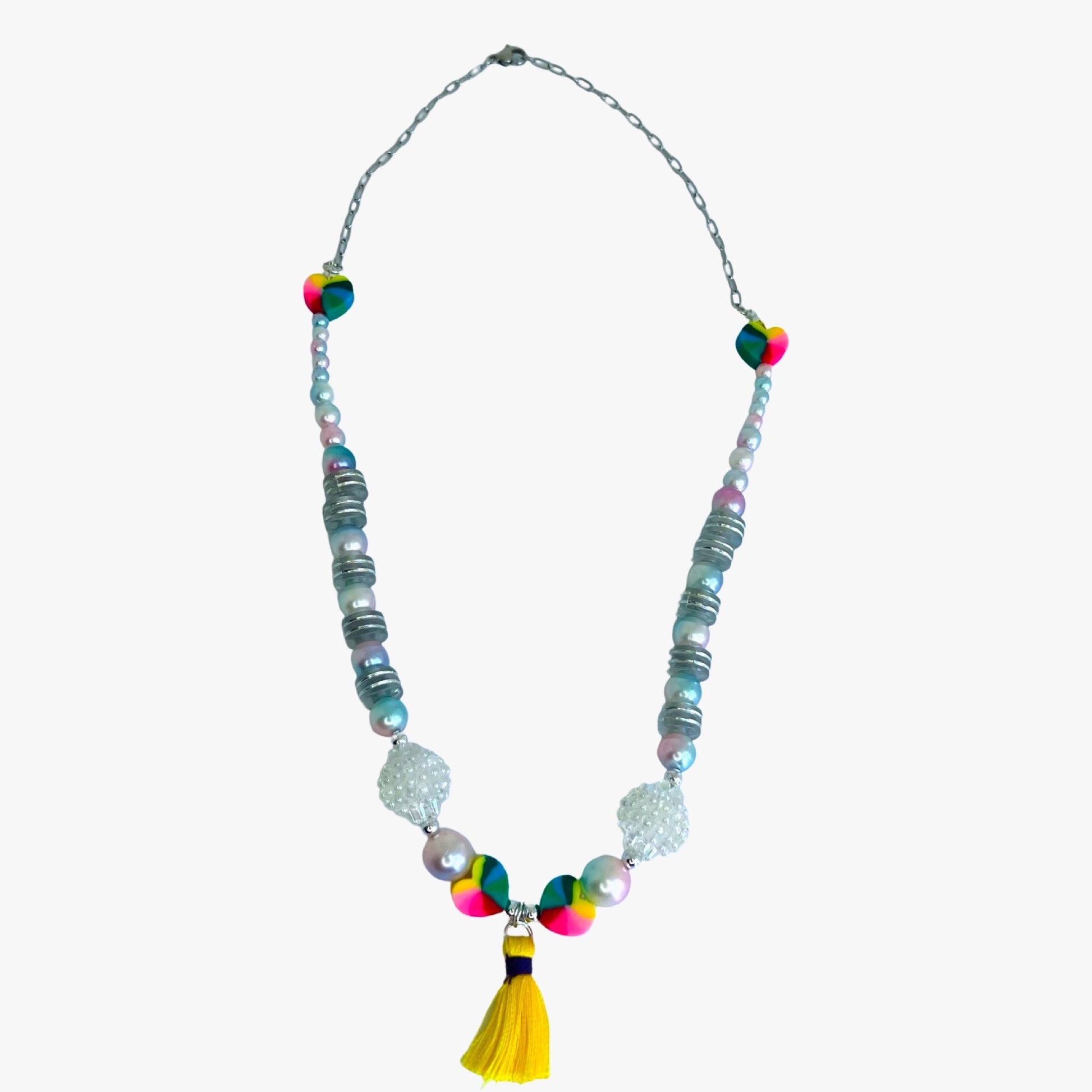 Kids handmade necklace made with texturized beads and unbreakable iridescent pearls, layered with clay multicolor heart. It includes a silver metal chain that adjusts to the neck and a beautiful tassel charm that adorns this design.