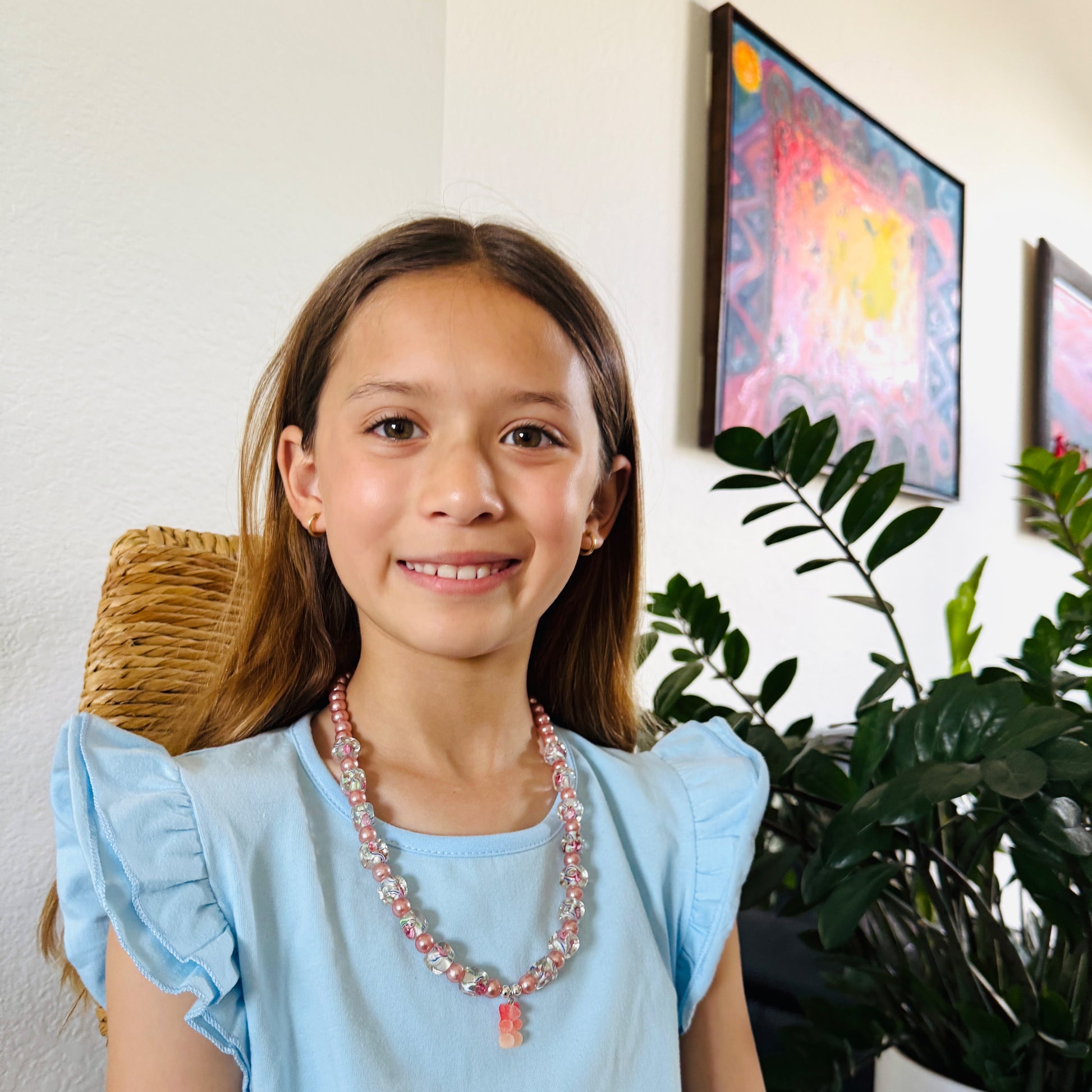 Handmade girl's necklace made with square clear glass beads and plastic pearls creating a modern and cute design. A resin gummy bear completes the design charming any little girl.