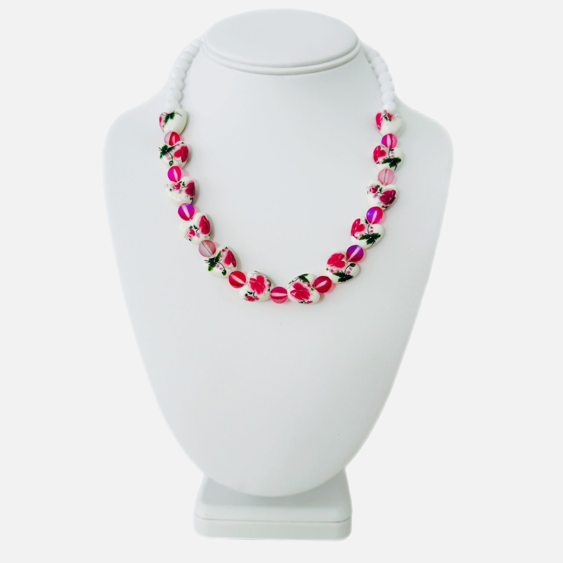 Girl's handmade necklace layered with ceramic flower painted hearts making it a showstopper and a favorite among moms.