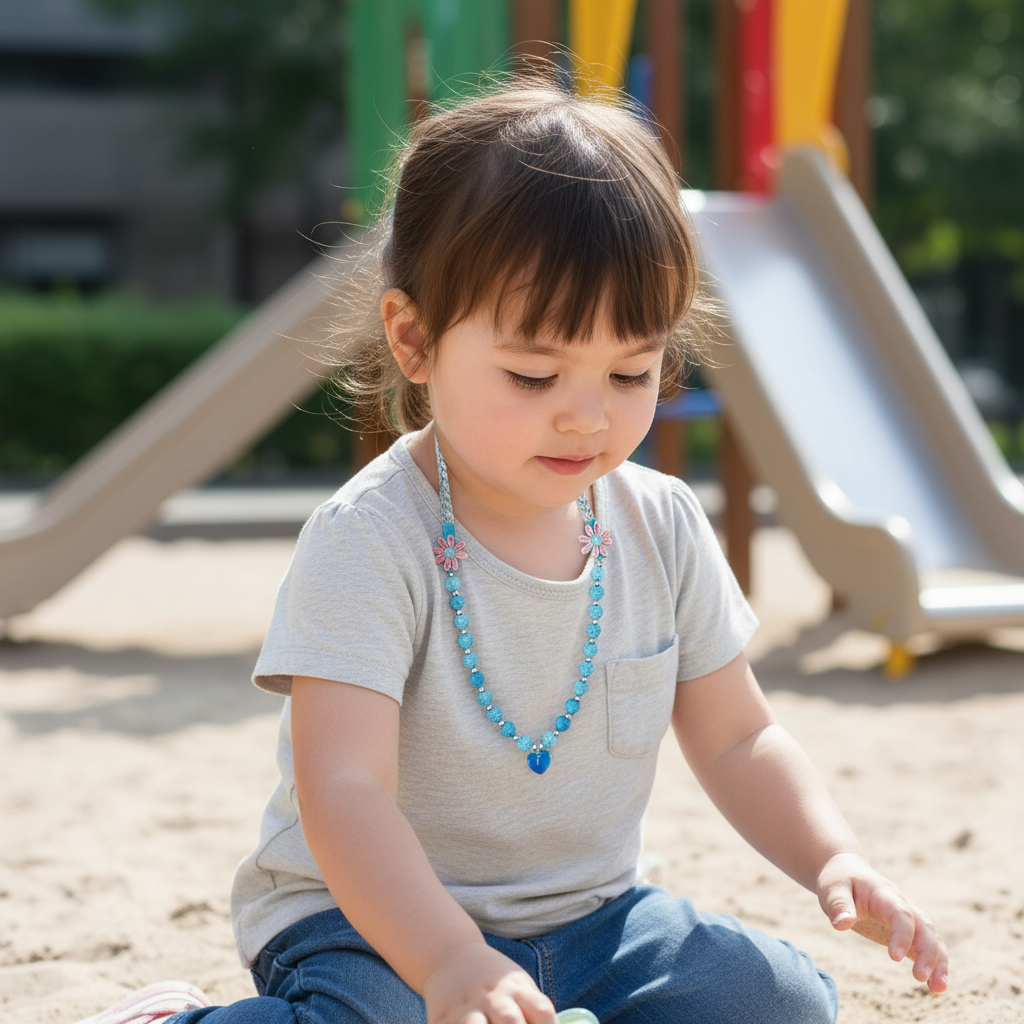 Girl's handmade necklace made of delicate and elegant blue toned ceramic beads surrounding a cute acrylic blue heart. The silver braided collar is adorned by cute pink embroidered flowers