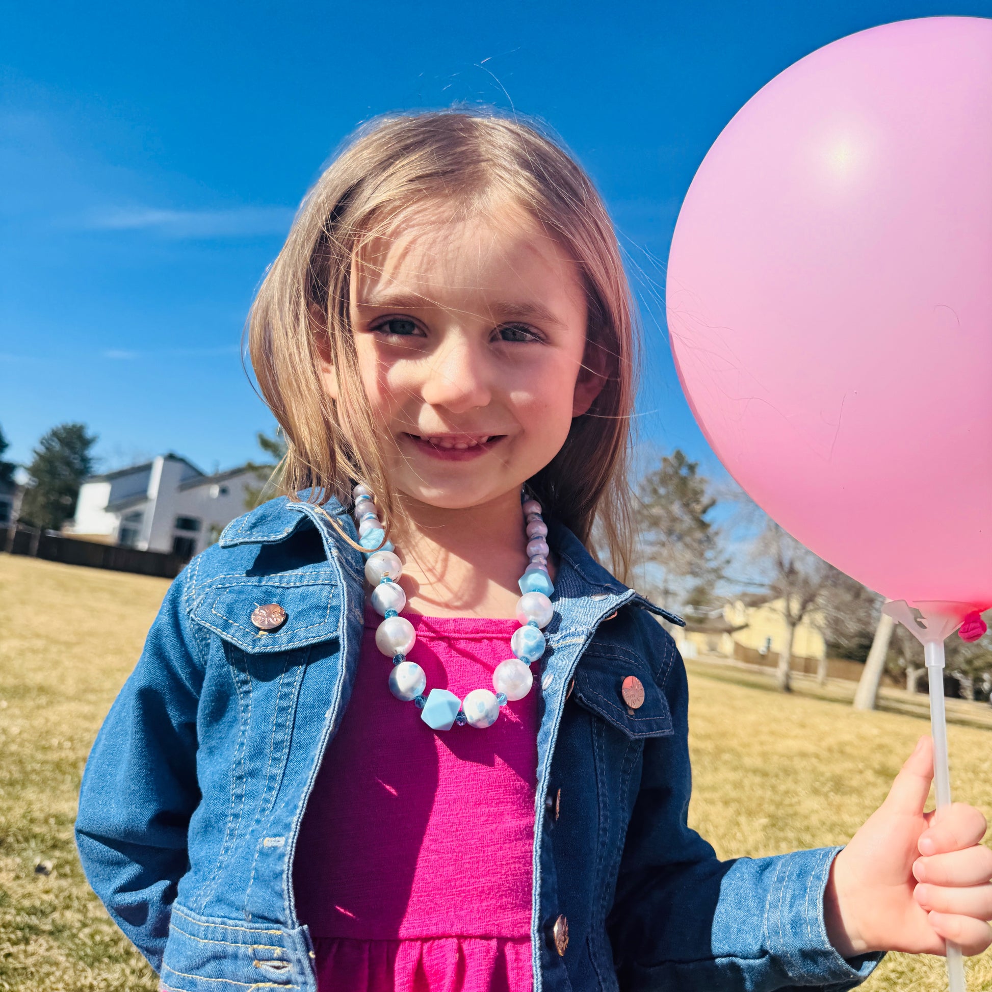 Girl's handmade necklace made with oversized white pearls and ceramic beads giving an elegant look for any occasion. Silicone hexagonal beads adorn this design, making it very modern and trendy.