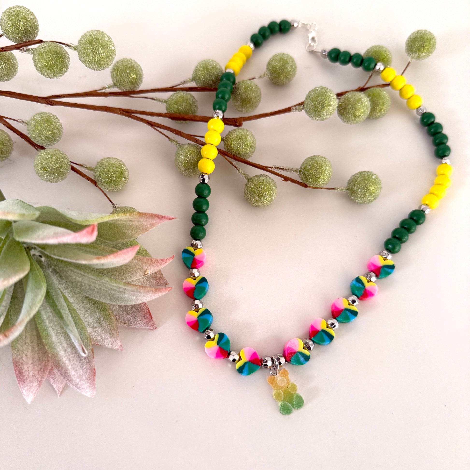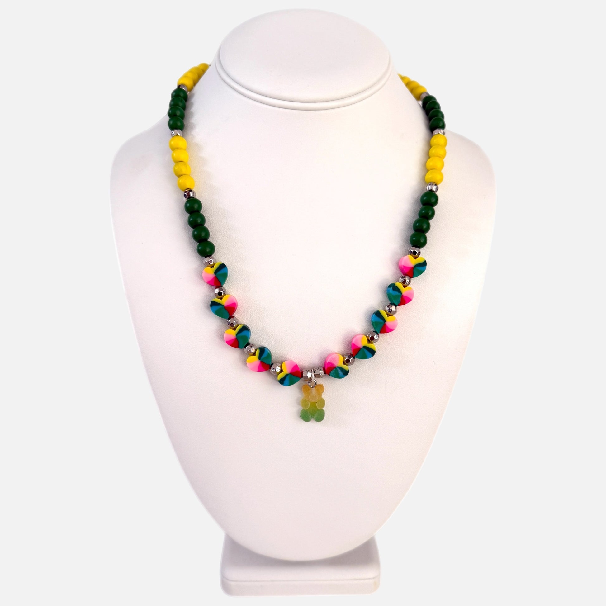 Bring on the sunshine and fun with our Natalie Tropical Necklace! This playful piece mixes bold green, yellow, and pink beads with a cute gummy bear charm that adds a sweet touch of fun. Perfect for girls who love bright colors and island vibes!